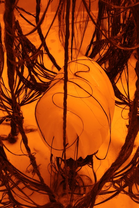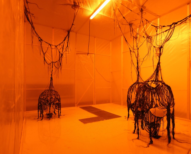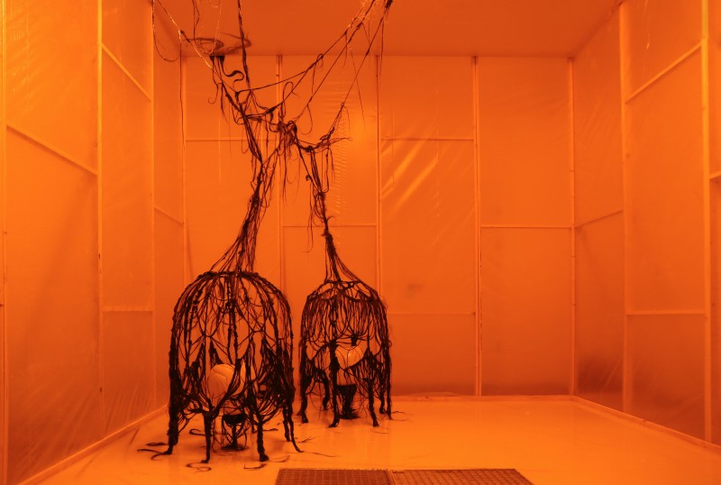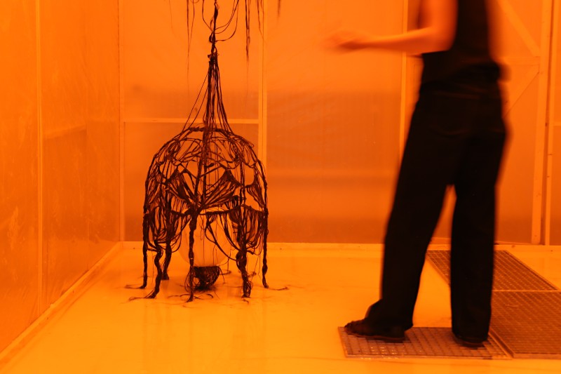 In einem Abstand von 80cm zu den Wänden des Ausstellungsraumes ist ein zweiter Raum aus Konstruktionsholz und Folie installiert worden. Ein warmes, orangefarbenes Licht strahlt aus dem Inneren des Raumes und lässt schemenhaft erahnen, was sich hinter der Folie verbirgt: Tropfnasses Haar hat sich zu Kuppeln geformt und umschließt darin weißliche Kerne aus Wachs.